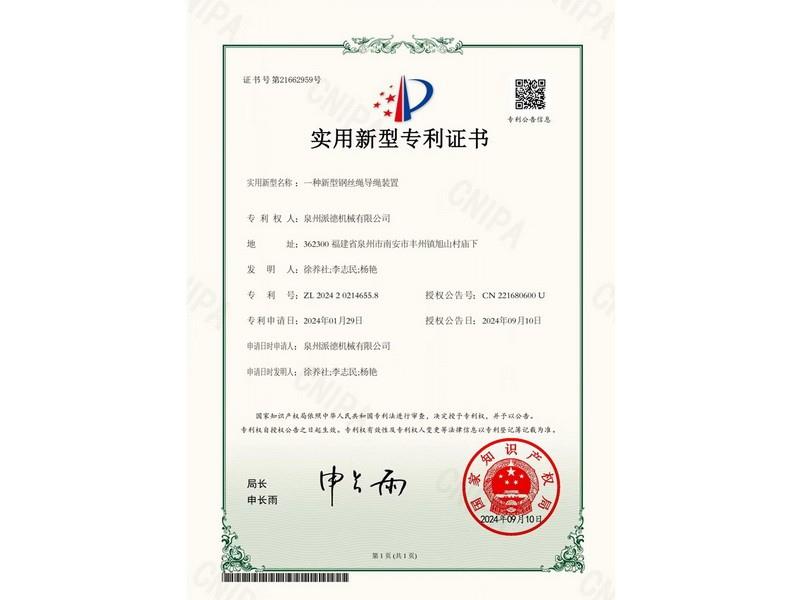 Utility model patent certificate (a new type of steel wire rope guide device)