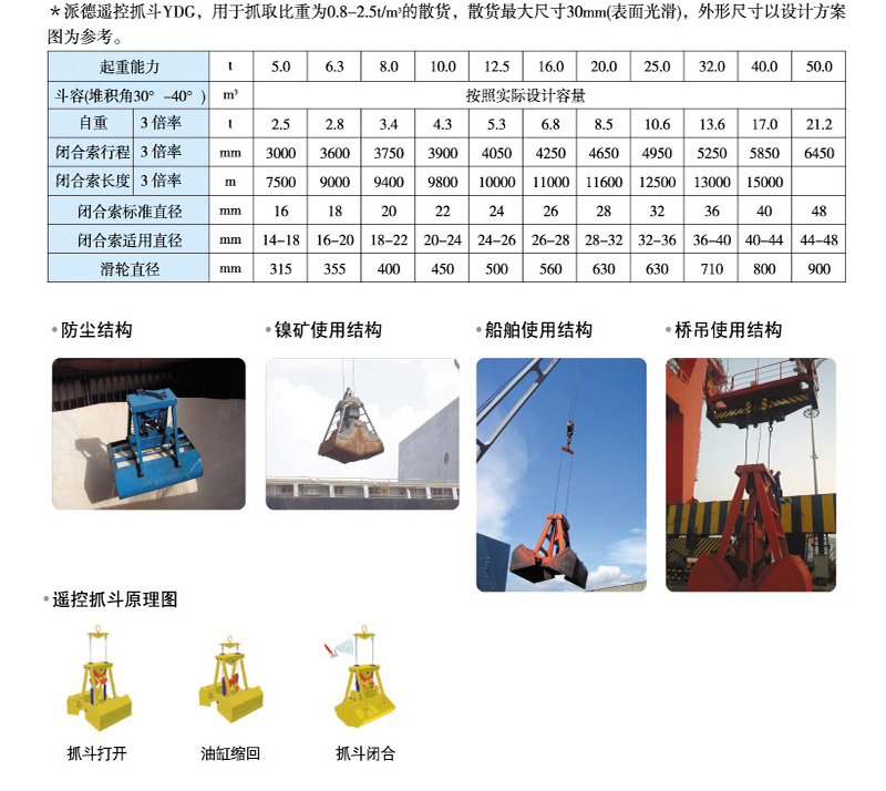 The remote control grab is a novel grab which is used to control the opening of a single cable crane through a wireless remote control transmitter. It does not need external energy. It can automatically close with the lifting of the hook on the pile, and can automatically open at any position in the air and stop at any time. There is a storage battery inside the grab, which controls the opening and closing of the grab by controlling the opening and closing of the solenoid valve. The grab does not need any other power supply, which is green. As a new invention of mechatronics, this grab is very popular with users. Its birth rewrites the history of low efficiency of single rope grab in the lifting and transportation industry. The remote control grab is generally composed of upper bearing beam assembly, sliding seat assembly, lower bearing beam assembly, bucket body, strut and oil cylinder. Among them, there are pulley blocks connected with the crane in the upper bearing beam assembly and sliding seat assembly, and the cylinder and piston rod of the oil cylinder are respectively connected with the lower bearing beam assembly and sliding seat assembly. The sliding seat can slide up and down under the action of the crane, driving the lower bearing beam to lift together, thus driving the grab to close; Through the remote control, the lower bearing beam and the sliding seat are separated, so as to control the opening of the grab.